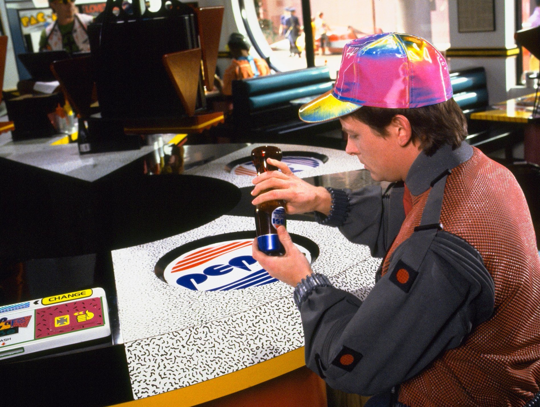 【シーン説明】ペプシ・パーフェクトを注文したマーティ。ドクからもらった50ドル札を見せると、モニターのレーガンは怪訝な顔をする。「現金?現金の場合は手数料がかかりますが…」。マーティには何のことかわからず「いいんだ、現金で払う」と押し切る。トレイに吸い込まれた50ドルから返金されたお釣りはたったの5ドルだった。【解説】シーン説明は小説版を元に、Eninieさんに台本も確認してもらいました。画像の左下が支払いコーナーと思われ、「キャッシュ投入口」と「親指認証」が写っている。マーティはおそらくあそこに50ドル札を入れたと思われる。2015年では親指認証による決済が主流で、老ビフもタクシーの支払いは“親指決済”。さらに、親指を切断して盗む「親指泥棒」なる犯罪が新聞で報じられていたりもする。現代から見るとマーティよりもレーガンの気持ちに共感してしまうのが面白い。カットの理由は時間短縮のため。なお、2015年のペプシ・パーフェクトは45ドルということだが、2024年の円安基準で考えると、1本7000円近い計算になる。 |