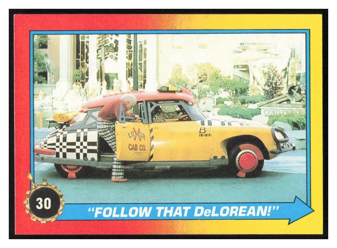 【シーン説明】路地で盗み聞きをし、ドクがタイムマシンを発明したことを知った老ビフ。ゴミ箱からスポーツ年鑑を拾うと、タクシーを止めて飛び乗る。ぶつぶつと独り言を続ける老人に、運転手は不安を覚える。肩に乗せた相棒のオウムも老人を見てから様子がおかしい。すると、老人が叫ぶ「あのデロリアンを追ってくれ!」。まるで昔の2D映画みたいなセリフだ。運転手は怪しみつつも、言われるがままデロリアンを追い始める。【解説】この写真はPART2公開当時に発売されていたトレーディングカードに収録されていたもの(現在でも映画ショップで購入可)。シーン説明は小説版より。台本上だと「どうやって追いかけるのか」を丁寧に描写したくなるが、映像でつないでみると不要だと分かる典型例。車中のドクの「追いかけられている」というセリフと、老ビフの乗ったタクシーがヒルデールへ入るカットだけで観客は状況を理解できるため、この場面は削られたのだろう。 |